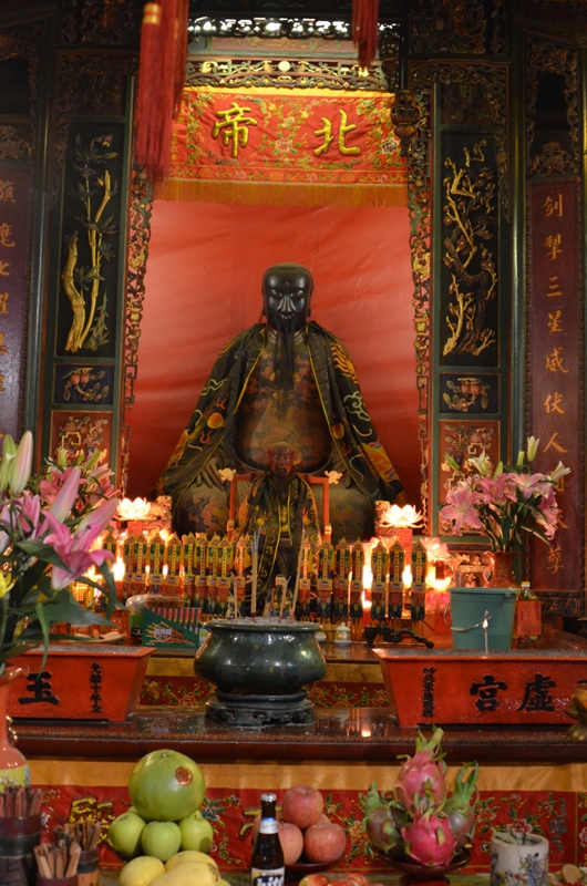 [font=新細明體]北帝一般造型[/font] [font=新細明體]早期的北帝造型未見有統一之說,然其[/font][font=新細明體]著名的武神、戰神形象則一直流傳;故[/font][font=新細明體]北帝造型多以[/font][font=新細明體]身帶鱗甲的武神形象示眾[/font][font=新細明體]。而其披[/font][font=新細明體]髮黑衣,仗劍蹈龜蛇的形像,則在[/font][font=新細明體]宋朝時期才確立。[/font][font=新細明體]北帝赤足仗劍,狀貌威武,許多征戰舉事者皆宣稱得到玄天上帝之庇佑,咸視其為保佑武運的大神。[/font][font=新細明體]北帝一般造型為:頭戴皇冠、威嚴顯赫、身披黑衣、五綹長鬚、面容慈祥、右手持北斗七星劍、左手印訣、赤足、右腳踏靈蛇、左腳踩神龜。身後衛將執黑旗,兩旁為金童玉女,水火二將。(6a)[/font][font=新細明體],[/font][font=新細明體]歷代北帝的造型不離此模式 。[/font] [font=新細明體]長洲北帝廟之北帝主神像,現時造型是沒有長鬚的;這不但與廟內的北帝分身有別,也與全國各地的北帝造型不同。[/font][font=新細明體](8)[/font][font=新細明體]北帝像一腳踏神龜,一腳踏靈蛇,代表無尚權威。神壇兩旁立著千里眼和順風耳兩員大將,而旁殿則設有青龍及白虎像。[/font][font=新細明體]北帝踏下之玄武雖是一種靈物,然一般皆將其二分為龜和蛇。[/font][font=新細明體]但凡拜北帝的人都不會吃兩樣食物,一是蛇,二是龜。 因為龜與[/font][font=新細明體]蛇都是北帝的象徵,因此絕不冒犯[/font][font=新細明體]。北帝又稱黑帝,故不但衣服旗幟是黑色,其神像以黑色為最神驗。[/font] [align=left] [/align][ 本帖最後由 宏泓道者 於 2014-1-2 10:54 AM 編輯 ]