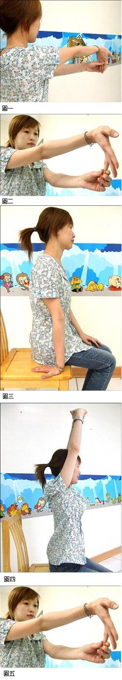 ●將手臂向前伸直延伸,手掌朝前,另一手將手指緩慢往下(圖一)。