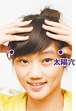 太陽穴位置在眉梢至耳朵間約1/3處,用手觸摸凹陷處。大拇指放在太陽穴上,其餘4指放在頭部,以按壓法按約10~15下。
