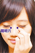 雙手大拇指放在兩側眉頭的攢竹穴,其餘4指放在頭部,雙眼閉起來,以按壓法按15~20下。