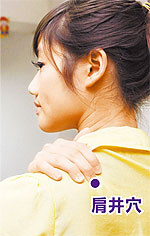 肩井穴在肩膀後方3個指幅的骨頭凹陷處。可用中指的指腹下壓穴位約6秒,重複約10~20次,再換另一側。