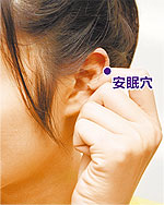 安眠穴在耳朵耳廓的約1/3處,用大拇指與食指包覆耳朵,由上到下來回按壓約10~15下。