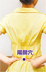 陽關穴的位置在背部第四、五腰椎中間。以兩手拇指的指腹按壓約6秒,重複10~20次。
