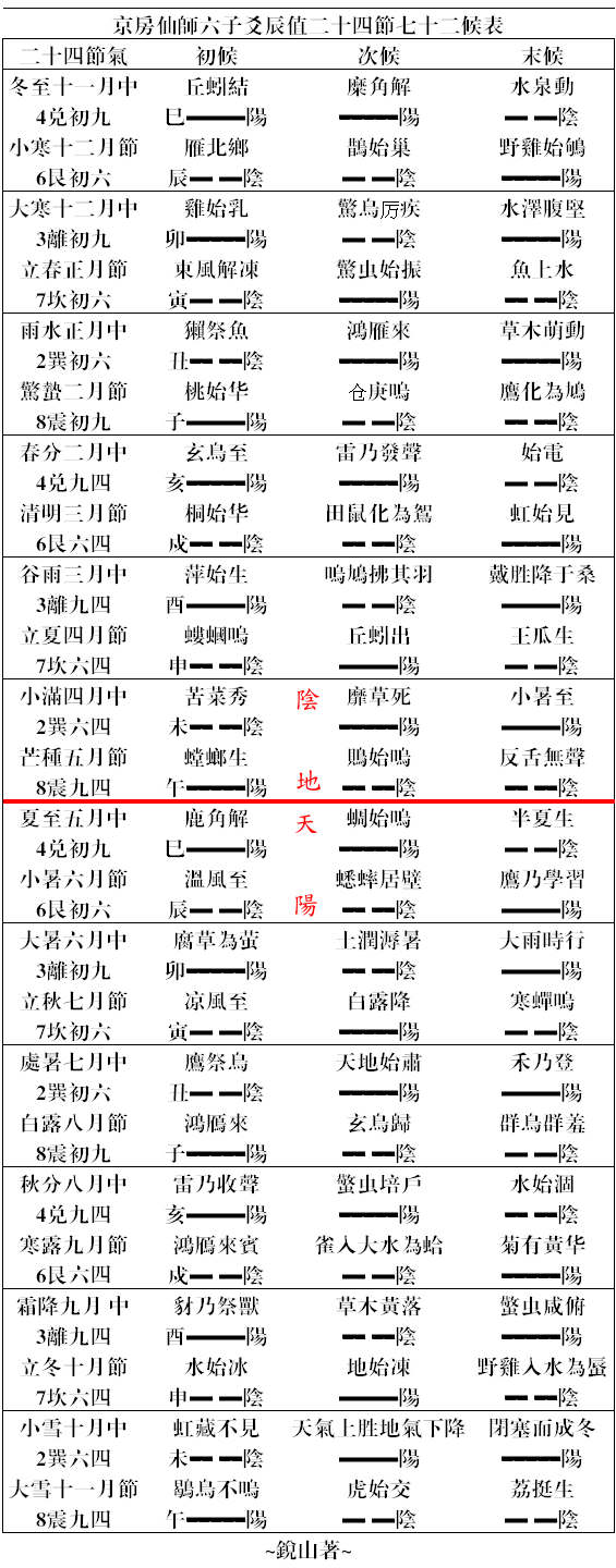 《京房易傳》”陰從午,陽從子.子午分行,子左行,午右行,左右凶吉,吉凶之道.子午分時,立春正月節在寅,坎卦初六,立秋同用.雨水正月中在丑,巽卦初六,處暑同用.驚蟄二月節在子,震卦初九,白露同用.春分二月中在亥,兌卦九四,春秋分同用.清明三月節在戍,艮卦六四,寒露同用.谷雨三月中在酉,離卦九四,霜降同用.立夏四月節在申,坎卦六四,立冬同用.小滿四月中在未,巽卦六四,小雪同用.芒種五月節在午,乾宮九四,大雪同用.小暑六月節在辰,艮宮初六,小寒同用.大暑六月中在卯,離宮初九,大寒同用”.