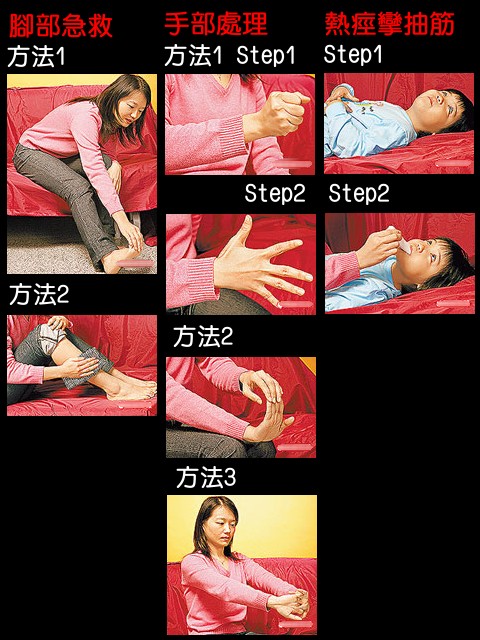 兩手十指交叉向前用力推出,讓手指有撐開拉緊的感覺,持續直到不再抽筋為止。熱痙攣抽筋