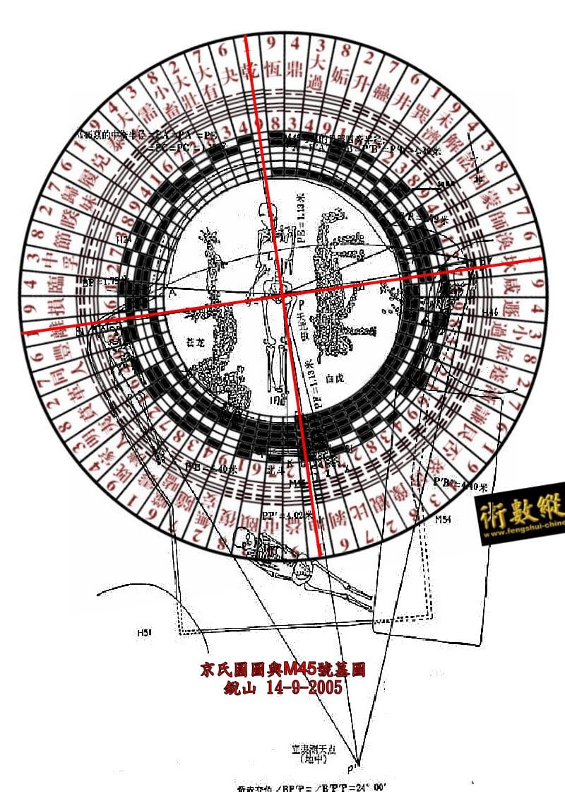 所以,四位人殉的性質分別象徵春分神、秋分神和冬至神、夏至神,其位置都被安排在他們所象徵的二分二至日道的外側,規律嚴整。夏至之神讓位於墓主升天的需要而擺放在距離大墓20米遠的地方。因此,整個墓葬完整地展示了分至四神的場景。我們還可以將墓穴的實際情況與《堯典》中的古史傳說及蓋天理論一起考慮,同樣也可以作出這樣的結論。關於分至四神的神话記載,可以看一看《楚帛書》。」「進一步講,如果用京氏圓圖去套,再把磁子午偏東三度校正回來,簡直就是乾卦。太陽周日視運動路徑和周年運動路經綫都在了。」