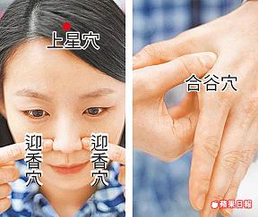 額頭髮際正中央往上約1指寬的上星穴、鼻翼兩側與法令紋交界的迎香穴,及大拇指、食指間虎口凹陷處的合谷穴,可疏通鼻竅,各穴位用指腹按壓10~15下。
