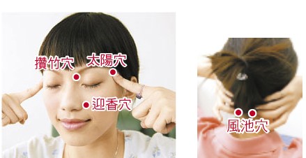 台北市立聯合醫院中醫院區中醫師陳朝宗表示,可按摩眼睛周圍的穴道,如位於眉尾凹陷處的太陽穴、以及左右眉毛內側眉頭凹陷處攢竹穴等,可舒緩眼睛癢的情形,而按摩位於鼻翼兩側的迎香穴可舒緩鼻子癢。外用藥物暫緩解
