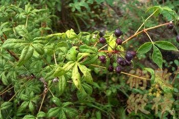 [font=宋体][植物形态] [/font]灌木,有时成蔓生状,高2?3m。枝灰褐色,无剌或在叶柄基部单生扁平的剌。掌状复叶在长枝上互生,在短枝上簇生;小叶通常5,稀3?4,中央一片最大,几无柄,倒卵形或披针形,长3?8cm,宽1?3.5cm。先端渐尖,基部楔形,边缘有钝细锯齿,两面无毛或被疏毛,下面脉腋有簇毛;具柄。伞形花序单生于叶腋或短枝上,无毛;花小,黄绿色;萼有5齿;花瓣及雄蕊5数。桨果近球形,侧扁,熟时黑色。花期5?8月,果期7?10月。