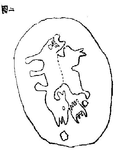 第一組蚌圖即B1發現於T137仰紹文化第四層下,打破第五層和生土。這一組蚌圖在墓主人的墓穴裏,其造型有龍和虎兩種,分別擺塑於編號為第45號墓的墓主人的左右兩側。龍在右,虎在左,龍虎皆背朝墓主人,頭皆朝墓主人腳端的方向,尾皆朝墓主人頭部的方向。這種擺法也許是出於透視上的考慮,即在埋葬者看來,墓主人仰身朝上,和龍虎側身朝下,其實都是正面直立朝前行走,墓主人屍骨已僵當然不可能有這種動勢,但龍、虎行走的動勢極強。龍的身體是一條S線,昂首張嘴,挺胸弓背,龍尾有力地擺動,龍爪張開,全身都處在極度亢奮的躍進狀態中。虎的四條腿擺動的幅度雖然不大,但很生動,展現了奔走過程中前後左右四腿交替落地和離地的瞬間。(見下圖)