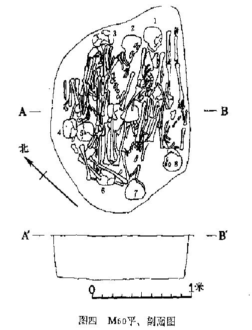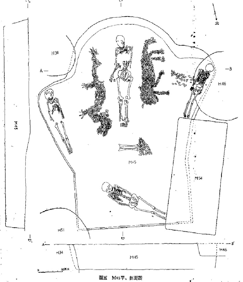 當時與45號墓同時發掘的,還有31號和50號兩座墓葬。50號墓(編號:M50)共葬有8人,屍骨淩亂,明顯是一個人殉葬坑(見下圖)。這個墓葬不在本文主題之中,不去談它。