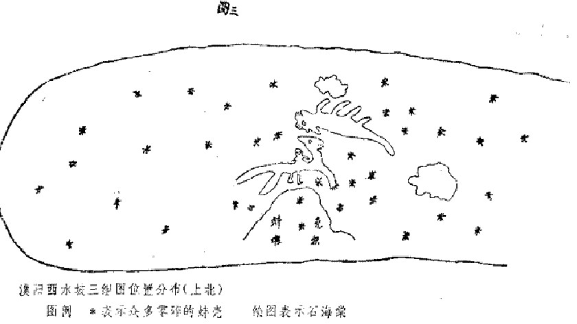 第三組蚌圖B3發現於B2正南25米處的T215中(見下圖)。這一組蚌圖,灰溝的走向由東北達西南,底部鋪墊有0.10米左右的灰土,然後在灰土上擺塑蚌圖,圖案有人騎龍造型、虎造型及其他。人騎龍擺塑於灰溝的中部偏南,龍頭朝東,背朝北,昂首、長頸、舒身、高足,背上騎有一人,兩足跨在龍的背上,一手在前,一手在後,面部微側,好像在回首觀望。虎擺塑于龍的北面,背朝南,頭朝西,與龍正好相反相背,它仰首翹尾,四足微曲向後,呈奔跑和騰飛狀。此外,關於第三組蚌圖B3,具體來講,在龍的南面、虎的北面、龍與虎的東面,各有一堆蚌殼,共計三堆蚌殼:1.龍南面的蚌殼面積較大,高低不平,成堆狀。2.虎北面和龍虎東面的兩堆蚌殼較小,形狀為圓形(見下圖)。另外,在第三組蚌圖B3這一層位上,還有許許多多零星的蚌殼,似乎也並非隨便亂扔的。從整體看,這條灰溝好像一條空中的銀河,灰溝中的零星蚌殼,猶如銀河中無數的繁星(見下圖)。那麼,那些堆積的蚌殼和成圓圈狀的蚌圖,是否同大地山川和日月星辰有什麼聯繫呢?人馭龍和奔虎襯托在這樣的背景上,是何等的壯觀!