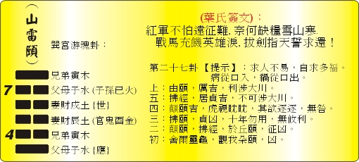[font=Arial]2: [/font][font=新細明體]「易經」第二七籤[/font][font=Arial]: “[/font][font=新細明體]山雷頤"[/font][font=Arial],[/font]