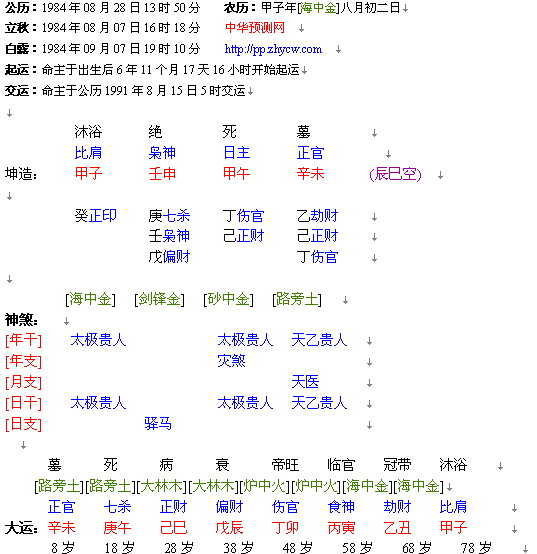 [font=宋体][size=10]公历:[/font][font=Times New Roman]1984[/font][font=宋体]年[/font][font=Times New Roman]08[/font][font=宋体]月[/font][font=Times New Roman]28[/font][font=宋体]日[/font][font=Times New Roman]13[/font][font=宋体]时[/font][font=Times New Roman]50[/font][font=宋体]分 [/font][/size][font=宋体][size=10]立秋:[/font][font=Times New Roman]1984[/font][font=宋体]年[/font][font=Times New Roman]08[/font][font=宋体]月[/font][font=Times New Roman]07[/font][font=宋体]日[/font][font=Times New Roman]16[/font][font=宋体]时[/font][font=Times New Roman]18[/font][font=宋体]分 [/font][/size][font=宋体][size=10]白露:[/font][font=Times New Roman]1984[/font][font=宋体]年[/font][font=Times New Roman]09[/font][font=宋体]月[/font][font=Times New Roman]07[/font][font=宋体]日[/font][font=Times New Roman]19[/font][font=宋体]时[/font][font=Times New Roman]10[/font][font=宋体]分 [/font][font=宋体] [/font][/size][font=宋体][size=10] 沐浴 [/font][font=Times New Roman] [/font][font=宋体]绝 [/font][font=Times New Roman] [/font][font=宋体]死 [/font][font=Times New Roman] [/font][font=宋体]墓 [/font][/size][size=10][font=Times New Roman]