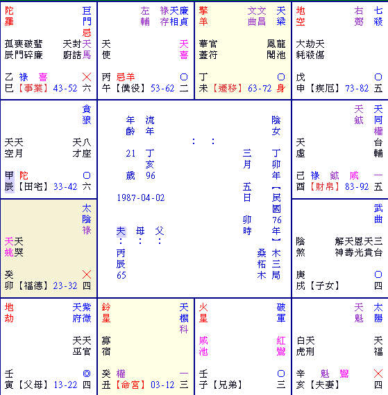 |祿23|流年 96 歲次丁亥 大限壬寅 虛歲 21| 天 16|