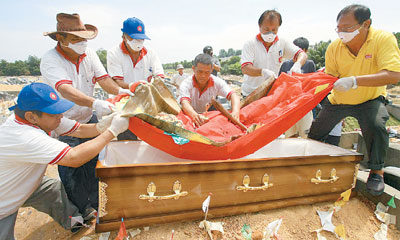 二零一一年四月十日 凌晨十二时四十七分(大山脚9日讯)儿子患病逝世、2名女儿以及一名外孙车祸身亡、还有一名女儿患上怪病,一户王姓家属因接二连三发生意外或罹患怪病,经神明指示始知祖坟风水被破,今天进行拾金仪式时,揭发深埋地底14年的尸体竟达90%未腐化!
