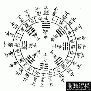 先天元運圖, 內層圈內先天卦收水, 而外卦二十四山所變出的卦, 收山.比方說內圈天卦坎水, 旺於上元一白, 而子未卯巳所變出為坎卦, 亦收上元山.又比方說, 天卦離水旺於下元, 地卦午酉丑亥龍所變出的為離卦, 收山.其義一言已蓋之, 陰陽與動靜, 顛倒之使用法則.