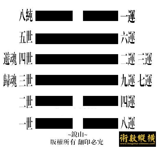 【奇數】為京房仙師八宮卦建世在一爻,三爻,五爻,歸魂爻(三爻).即一世,三世,五世,歸魂(三爻).凡是一世者為八運,三世者為九運,五世者為六運,歸魂者為七運.全為奇爻.