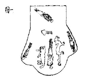 在這裏,我們再詳細描述一下第一組蚌圖即B1(見下圖):墓穴西北部被東周時期的M54打破,東南、西南、東北部分別被仰韶時期的H34、H46、H51打破,看看吧!後代的人們都知道這個地方是大穴位,都想在上頭建宅葬墓。不過還是可惜呀,除了這個墓主人,誰也沒葬在正位上,都偏到四隅方位去了,也怪,剛好都偏到穴心的四隅,除了慨歎點穴之不易外,還引起我們這些後來人無限的神秘聯想。墓葬的方位是頭南足北、左西右東的形式;它的南邊是形成一個圓弧的形狀,而北邊是一個方形,東西兩側還有一個弧形的龕;靠南的中央是墓主人,他的頭是向南的,生前身高在1.79米到1.84米之間,墓主人的身旁,亦即東西兩側,還有他的腳下——也就是他的北側有三具殉人。45號墓中3具人殉的擺放位置很特別,被分放在墓穴中東、西、北三處,並特意斜置形成一定的角度。這三具人殉,年齡較小,分別埋於墓室東、西、北三面小龕內。東部龕內的人殉,頭向南,仰身直肢葬,骨架保存得不好,性別未經鑒定。西面龕內的人骨身長1.15米,頭向西南,仰身直肢葬,兩手壓於骨盆下,性別為女性,年齡在12歲左右,頭部有刀砍的痕跡,顯然是非正常的死亡者。北面龕內的人骨,身長約1.65米,頭朝東南,仰身直肢葬,兩手壓在骨盆下,年齡在16歲左右,骨骼粗壯,性別為男性。顯然這是三具殉葬的童男童女,都屬於非正常死亡。根據對墓主人骨骼的研究,墓主人是一個50至55歲左右的男性;尤其奇特的是在墓主人的兩側(東、西)和他的腳下(北),有三組由蚌殼密集鑲嵌在地上擺塑組成的圖案,其中在墓主人的右側,也就是靠東的方向,是一個蚌龍,身長1.78米,高出地面0.67米;在左側也就是靠西的這個方向,是一個蚌虎,身長1.39米,高出地面0.63米,虎的腹部,有一堆散亂的蚌殼;龍、虎頭的朝向均為北,腿則均向外;而在墓主人的腳下(北),有一個蚌殼密集鑲嵌擺成的介於三角形與梯形之間的圖案,另外在這個三角形圖案的東側還擺\放了兩根人的脛骨,距墓室中部壯年男性骨架0.35米,脛骨與三角形圖案連在一起,指向東方,指向龍的腦袋。另外,在45號墓穴以外的同一層位上,還有兩處用蚌殼擺塑而成的龍、虎、鹿等動物圖形,這兩處圖形和45號墓在同一子午線上。