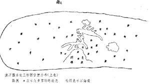 第三組蚌圖B3發現於B2正南25米處的T215中(見下圖)。這一組蚌圖,灰溝的走向由東北達西南,底部鋪墊有0.10米左右的灰土,然後在灰土上擺塑蚌圖,圖案有人騎龍造型、虎造型及其他。人騎龍擺塑於灰溝的中部偏南,龍頭朝東,背朝北,昂首、長頸、舒身、高足,背上騎有一人,兩足跨在龍的背上,一手在前,一手在後,面部微側,好像在回首觀望。虎擺塑于龍的北面,背朝南,頭朝西,與龍正好相反相背,它仰首翹尾,四足微曲向後,呈奔跑和騰飛狀。此外,關於第三組蚌圖B3,具體來講,在龍的南面、虎的北面、龍與虎的東面,各有一堆蚌殼,共計三堆蚌殼:1.龍南面的蚌殼面積較大,高低不平,成堆狀。2.虎北面和龍虎東面的兩堆蚌殼較小,形狀為圓形(見下圖)。另外,在第三組蚌圖B3這一層位上,還有許許多多零星的蚌殼,似乎也並非隨便亂扔的。從整體看,這條灰溝好像一條空中的銀河,灰溝中的零星蚌殼,猶如銀河中無數的繁星(見下圖)。那麼,那些堆積的蚌殼和成圓圈狀的蚌圖,是否同大地山川和日月星辰有什麼聯繫呢?人馭龍和奔虎襯托在這樣的背景上,是何等的壯觀!