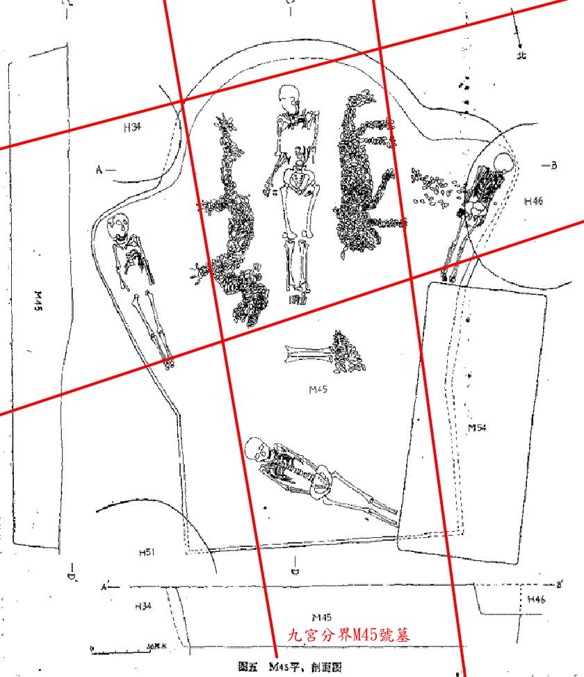 以二十八宿風水學理論, 只有皇帝是墳子午向, 而45號墓主應是《天官書》所說中官北極位置, 以正北論, 頭骨應是面向帝星, 中官又表示「太一」所居位置, 以宮廷為中心, 「太一行九宮」, 即風水「吊宮」理論.r