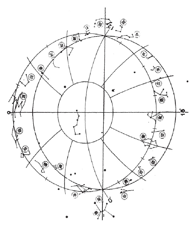 這兩幅圖怎麼用?好用!說破不值錢。將青圖畫放在黃圖畫上,兩個O點重合,順時針轉動黃圖畫,當太陽轉入青圖畫範圍內時表示日出,當太陽轉出青圖畫範圍內時表示日落——當然,您要是願意,日月五星都好用,不過,您得先把圖做得夠大,刻度標得夠精確,恒星背景位置夠準確。又有人打岔了:“這下子要不要考慮天星西移呀?”您要是打定主意讓您家祖墳發個720年,那當然是要考慮的。哈哈……