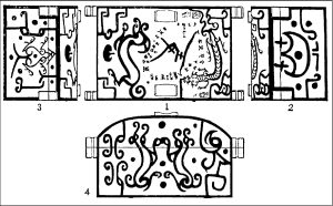 第三圖可能沒什麼人見過。這是第二圖衣箱四面圖案的描摹圖,其中:1.曾侯乙墓衣箱蓋面,已如前述。2.衣箱東立面,位居蒼龍之下,此圖案狀如火形,正是大火星象,代表心宿。3.衣箱西立面,位居白虎之下,此圖案狀如四足岐尾大龜,《後漢書.杜篤傳》“觜”,李賢注曰:“觜,大龜。”代表觜宿。4.衣箱北面乃是雙鹿圖像,二鹿四足相抵,首尾同向。