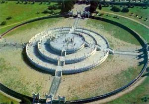 好了,看到上面第一幅全貌圖中右上角偏中間位置的圓丘了嗎?是不是明顯地有三層圓壇的痕跡?那麼它的完好模樣是怎麼樣的呢?我當然沒辦法帶你去看一個完好無缺的紅山文化圓丘了,但是我帶你去看一個實際上代表的意義與其完全一樣,而且模樣也基本一樣的——