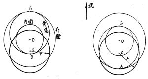 現在如果我們把以C點為圓心,以r為半徑的圓從上面兩個圖上拿走,那麼剩下的就是內衡、外衡以及以AB為半徑的黃道圈,而這些都是在同一個恒星背景上的圓,他們的相對位置都是固定的,他們的旋轉,以O為中心的旋轉(黃道圈以黃極為中心旋轉,但是由於黃赤交角相對固定,通過坐標系轉換,其實可以視為以O點為中心旋轉),就演示了任意某一天的晝夜更替現象——只要您把七衡圖或者三衡圖擴張成為365衡圖就行了。