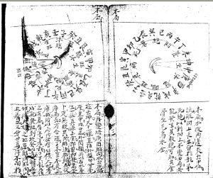 東北,震。水書震卦符號,象貓臉,就是“寅”;象太陽在地平線之下,太陽本身形狀殘缺,象陽氣從地下衝齣。