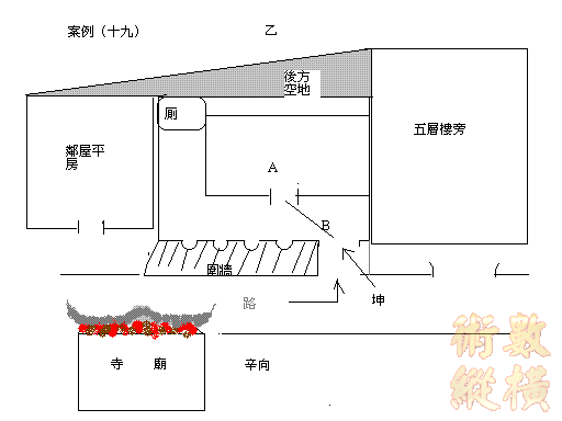 劣者再說這宅還好沒有加上巷路直沖或劍尖路,否則你整隻腿得要鋸斷做義肢!(二)宅主又請劣者看隔壁鄰居此宅好嗎?此平屋大門直對廟屋簷上方凹方,並且廟簷又是紅色,還好也沒有路沖對房份,這可能腦部有問題或想不開自殺之兆,若是自殺應該不會成功,這幾年可能會自殺不成而病死可能!