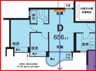 [font=標楷體]沖不一定是煞!可在[color=darkorange]橙色位置加裝由兩塊組成的短門簾,構成小玄關,緩緩來氣![/color][/font]