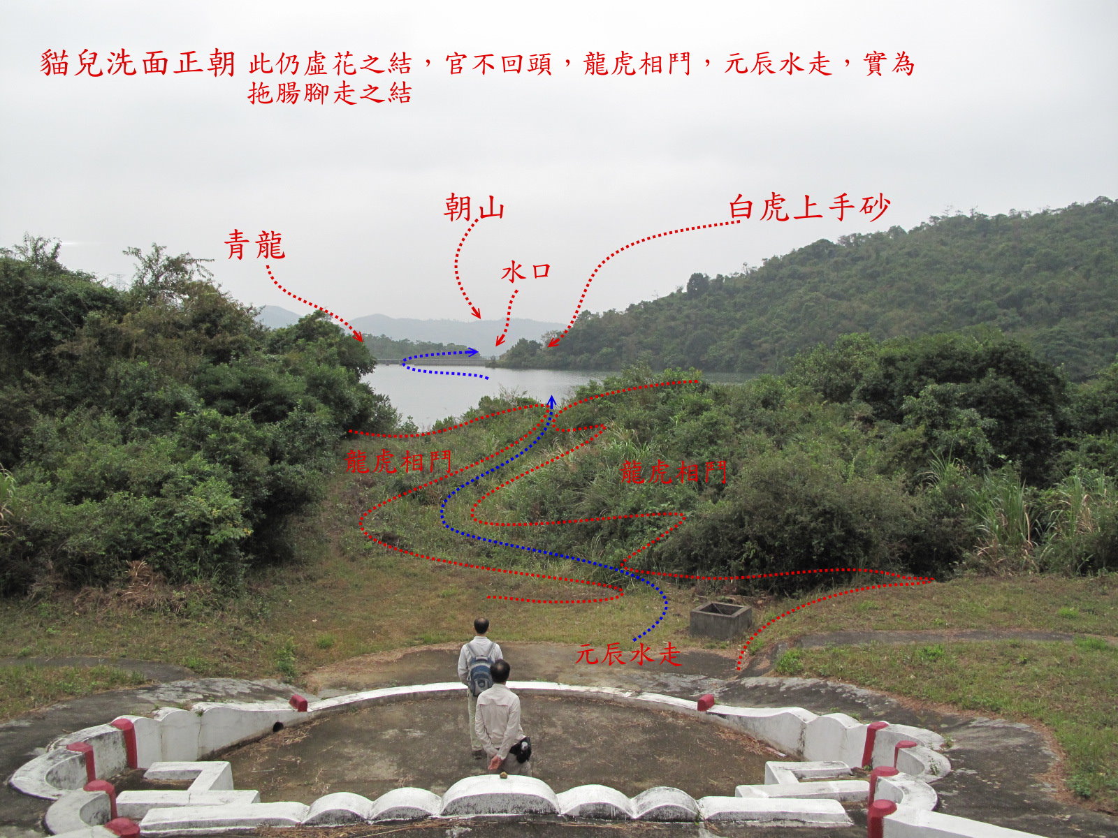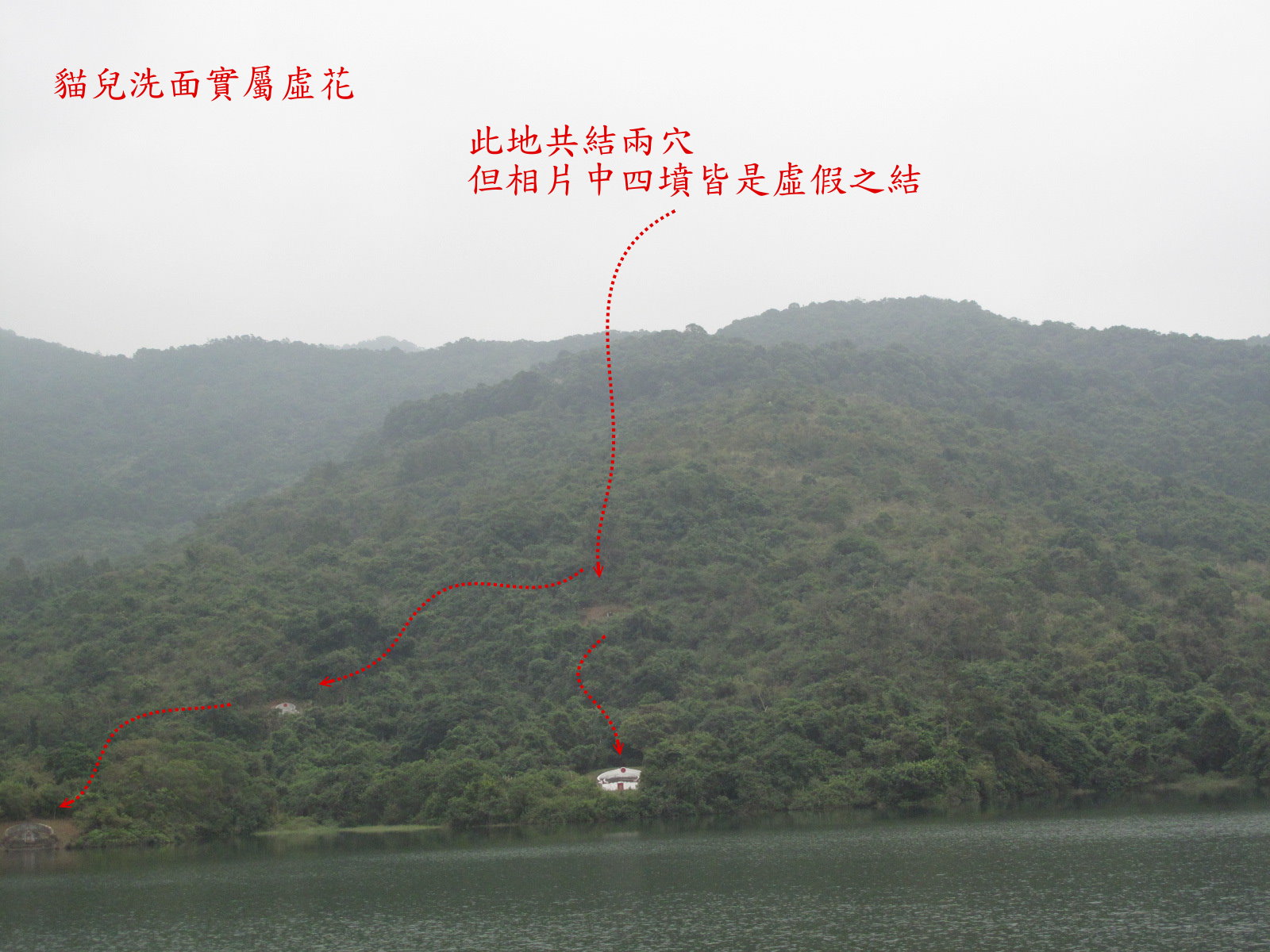 其墳塘邊葬低,遠看枕山峰巒厚盛,勢從後高遠來而低伏於塘邊。青龍低伏,白虎則高而貼穴,但未過穴而成白虎卷案。因白虎高貼穴如貓兒提起右手抹面,又穴星低伏塘邊,塘中水盛,故喝像成貓兒洗面也。