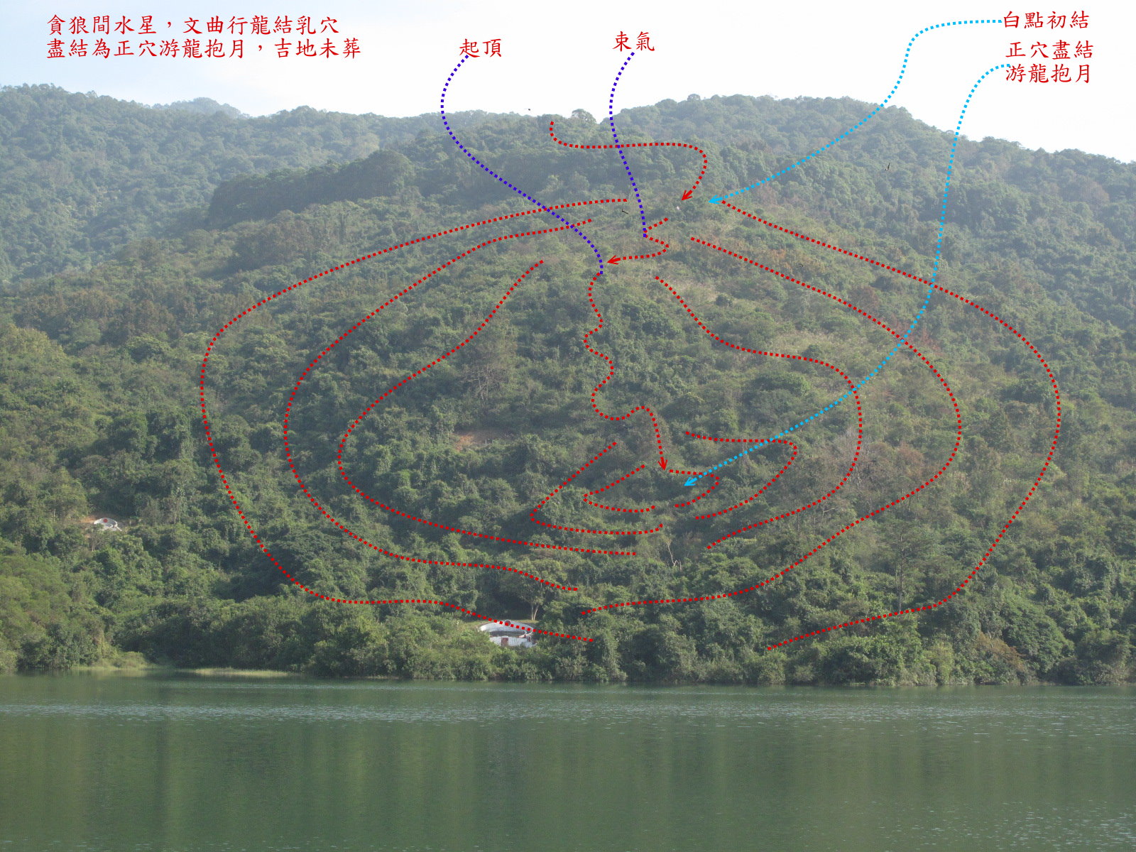 結穴多為金木土。此地少祖貪狼來龍脫換文曲水星龍,父母山雖峰巒厚盛,但只見半頂蛾眉,半有半無,似金而非金,文曲常作間星,為父母則少見也。