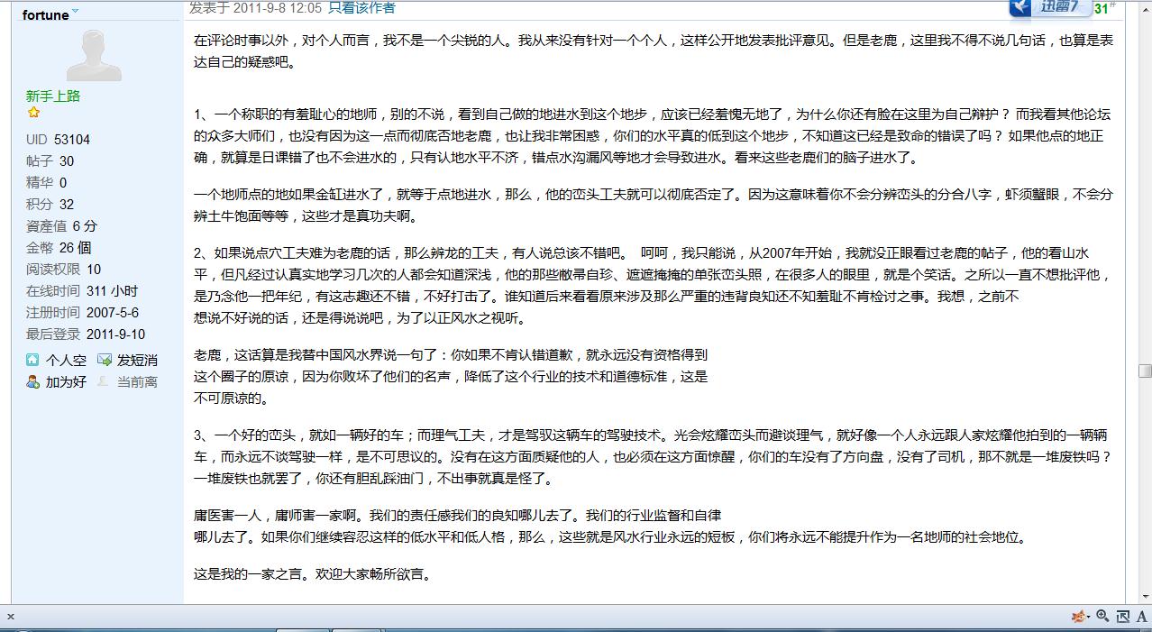 聽風聽水 公開 交流群 公開 交流群 天星與五星諸氣者因地氣上陞化為雨水復降地表,故形有所謂水、氣有所謂風。故云『風水』。 —— 呂祖先師降示 公開 交流群 組織者: Organized by 群組描述 (必填) 天星與五星諸氣者因地氣上陞化為雨水復降地表,故形有所謂水、氣有所謂風。故云『風水』。 —— 呂祖先師降示 離開組 Are you sure you want to leave ? 會員 RSS源 討論 照片 文件 影片 相簿 感謝鹿人版主多年來對本網支持 山法 感謝鹿人版主多年來對本網支持 Posted by 劉銳山 on 8 9 月, 2011 在 10:03 上午 由於鹿人版主與草魚事件糾纏已有相當時間,發展亦廣為人知,相信事情會繼續發展下去,為避免鹿人身心疲累之下,再顧及本網山法版務,所以讓他暫時退下術數縱橫版務,以便有更多時間享受山水之樂! 艮陽 replied 14 年, 1 月 前 9 Members · 11 Replies 11 Replies 許袁 會員 9 9 月, 2011 在 5:48 上午 真心感謝 benchong 會員 13 9 月, 2011 在 9:32 上午 :pig9:夠‘現實’:pig11: 董鬼谷 會員 13 9 月, 2011 在 9:38 上午 玩”陰宅”要<身殺兩停>:pig2: 為鑑~為惕~ [ 本帖最後由 董鬼谷 於 2011-9-13 05:41 PM 編輯 ] 劉銳山 會員 13 9 月, 2011 在 9:42 上午 原帖由 benchong 於 2011-9-11 01:25 AM 發表。 [size=13px]在评论时事以外,对个人而言,我不是一个尖锐的人。我从来没有针对一个个人,这样公开地发表批评意见。但是老鹿,这里我不得不说几句话,也算是表达自己的疑惑吧。 1、一个称职的有羞耻心的地师,别的不说,看到自己做的地进水到这个地步,应该已经羞愧无地了,为什么你还有脸在这里为自己辩护? 而我看其他论坛的众多大师们,也没有因为这一点而彻底否地老鹿,也让我非常困惑,你们的水平真的低到这个地步,不知道这已经是致命的错误了吗? 如果他点的地正确,就算是日课错了也不会进水的,只有认地水平不济,错点水沟漏风等地才会导致进水。看来这些老鹿们的脑子进水了。 一个地师点的地如果金缸进水了,就等于点地进水,那么,他的峦头工夫就可以彻底否定了。因为这意味着你不会分辨峦头的分合八字,虾须蟹眼,不会分辨土牛饱面等等,这些才是真功夫啊。 2、如果说点穴工夫难为老鹿的话,那么辨龙的工夫,有人说总该不错吧。 呵呵,我只能说,从2007年开始,我就没正眼看过老鹿的帖子,他的看山水平,但凡经过认真实地学习几次的人都会知道深浅,他的那些敝帚自珍、遮遮掩掩的单张峦头照,在很多人的眼里,就是个笑话。之所以一直不想批评他,是乃念他一把年纪,有这志趣还不错,不好打击了。谁知道后来看看原来涉及那么严重的违背良知还不知羞耻不肯检讨之事。我想,之前不 想说不好说的话,还是得说说吧,为了以正风水之视听。 老鹿,这话算是我替中国风水界说一句了:你如果不肯认错道歉,就永远没有资格得到 这个圈子的原谅,因为你败坏了他们的名声,降低了这个行业的技术和道德标准,这是 不可原谅的。 3、一个好的峦头,就如一辆好的车;而理气工夫,才是驾驭这辆车的驾驶技术。光会炫耀峦头而避谈理气,就好像一个人永远跟人家炫耀他拍到的一辆辆车,而永远不谈驾驶一样,是不可思议的。没有在这方面质疑他的人,也必须在这方面惊醒,你们的车没有了方向盘,没有了司机,那不就是一堆废铁吗? 一堆废铁也就罢了,你还有胆乱踩油门,不出事就真是怪了。 庸医害一人,庸师害一家啊。我们的责任感我们的良知哪儿去了。我们的行业监督和自律 哪儿去了。如果你们继续容忍这样的低水平和低人格,那么,这些就是风水行业永远的短板,你们将永远不能提升作为一名地师的社会地位。 这是我的一家之言。欢迎大家畅所欲言。 [/size] ?是你想要的結果嗎? 石易 會員 13 9 月, 2011 在 12:44 下午 原帖由 patton 於 2011-9-13 05:42 PM 發表。 ?是你想要的結果嗎? 唉 說真的小弟看法有人不夠聰明ㄚ! benchong 會員 14 9 月, 2011 在 2:51 上午 :pig7:我哪有这么好的文笔呢:pig8: 123.jpg 劉銳山 會員 14 9 月, 2011 在 2:56 上午 原帖由 benchong 於 2011-9-14 10:51 AM 發表。 :pig7:我哪有这么好的文笔呢:pig8: 本網有明文規定凡轉貼文章必須註明出處,若然我不是這樣一問,我就認為你是原作者了,所以,你是干犯了本網侵犯版權,稍後送往刑獄改造 罪證 https://forum.shusquare.com/forum.php?mod=viewthread&tid=99653&extra=page%3D1 第9樓 正气歌 會員 14 9 月, 2011 在 3:59 上午 ?benchong 我不得不说你几句,自吹自擂是你的擅长,煽风点火,打击他人提高自己是你的秉性。看不惯你的人品,不要不知羞耻变无耻! [ 本帖最後由 正气歌 於 2011-9-14 12:02 PM 編輯 ] 玄豐子 會員 16 9 月, 2011 在 3:51 上午 人生轉折已相逢,千頭萬緒入深淵,萬念俱灰志要堅,老蚌含水待過冬,同是天涯淪落人,祝福平安:f41: :f41: :f41: [ 本帖最後由 玄豐子 於 2011-9-16 11:54 AM 編輯 ] 陳宥名 會員 16 9 月, 2011 在 7:46 上午 是非曲直自在人心,誰對誰錯老天爺終會有評斷,一個好的論壇總不希望搞的烏煙瘴氣,支持副壇主的決定,留給五術界一個清淨的空間。:pig5: 艮陽 管理員 16 9 月, 2011 在 3:23 下午 原帖由 benchong 於 2011-9-14 10:51 AM 發表。 :pig7:我哪有这么好的文笔呢:pig8: 虽然我也经常转载别人的帖文,但我批评别人的话都是原创的,以示真诚之心,嘿嘿!你看。。。因为你是转载着批评他人,无论你用意如何,被指责是煽风点火也实在难免。受到处罚了吧。。。不过我还是认为你并非险恶用心之人,希望以后能够