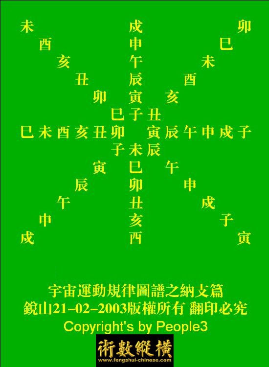 陽干為甲丙戊庚壬,以乾納甲壬,震納庚,坎納戊,艮納丙;陰干乙丁己辛癸,坤納乙癸,巽納辛,離納己,兌納丁.而以上是生剋制化配之,乾為金,金生壬水,壬水生甲木,生之;震東方木,庚金剋之;坎水,戊土剋之;艮宮丙火,土火生之,三剋一生;坤宮癸水生乙木剋坤土,辛金剋巽木,離火生己土,丁火剋兌金,三剋一生.故土為大地之母.基本概念就是依照洛書數軌跡,金生水右旋,木生火左旋,在雙旋雙向下,相生相剋.