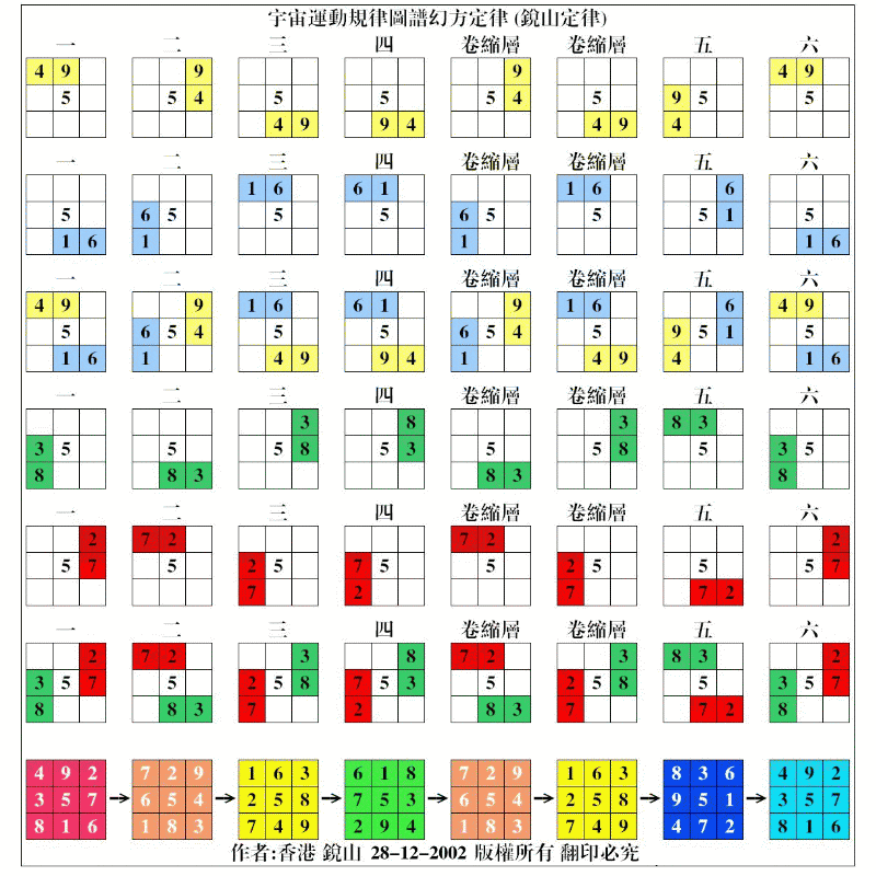 八卦,六爻概括萬事萬物,用以通曉神明,以六爻之變,觀測萬事萬物,而很多古籍堪輿書類,無不提及八卦,六爻,但我們又如何可以通曉六爻性質與洛書關係?除了納甲五行生剋制化外,過往各派術藝宗旨是秘密不宣,大家有沒有忽略了將八卦,六爻轉化成洛書數來參考運用,這法則是以往祖傳不宣秘密,但我們如何考量,把六爻轉化洛書數過程,不可天馬行空,閉門造車,脫離規律邏輯,把洛書數本質以及原來面貌扭曲.經云:”天一生水地六乘之,地二生火天七乘之,地四生金天九乘之,天三生木地八乘之,五生戊己土居中央”;一九三七二八四六皆合十,而左右各生成,這是不變定律.而我們過往只是看到九四三八二七六一洛書圖,又與六爻又有何關連及掛勾呢?