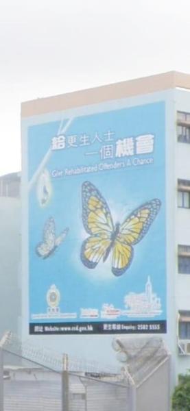 當晚瀏灠網上時,發現原來香港的懲教所,牆上劃有蝴蝶之圖案及標語『给更新人士一個機會』。