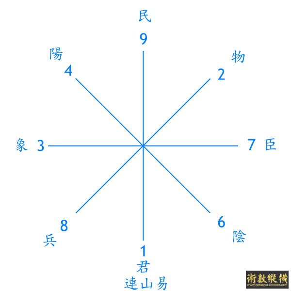 為了讓你們清楚明白,繪畫了連山八卦之名圖,君,臣,民,物,陰,陽,兵,象排列於洛書畫面上(見圖),以及在將它排序六十四卦符號.其實不應該說是卦,應是六十四名稱比較貼切!因漢字成文並不是一蹴而就,是要漫長時間,才慢慢形成 ,這次是根據太乙九占盤資料而把它排列.如果你們有留意我一路以來所講解洛書數,你們便會知道它們是相反統一規律,9 1合十民對君;4 6合十陽對陰;3 7合十象對臣;2 8合十兵對物.