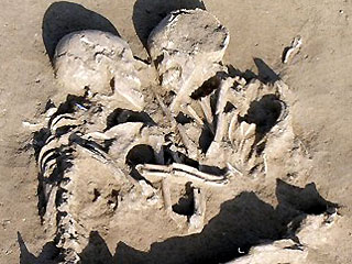 下图原来解释:这对男女曾生活在5000-6000年前的新石器时代,考古学家推测他们应该是对年轻人,因为他们的牙齿仍然保持完整。这是一个很有价值的发现,因为那一时期的合葬非常罕见,尤其是这样拥抱姿态的还是首次被发现。 -