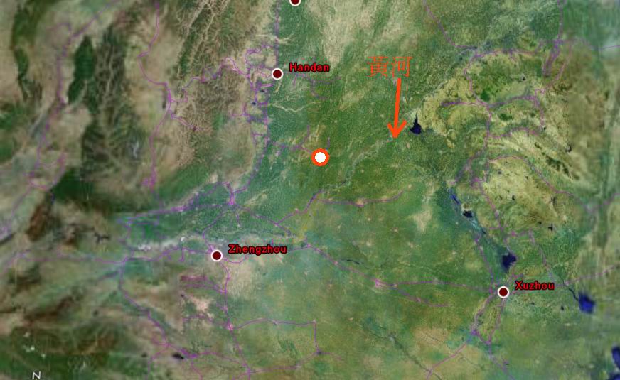 這是用google earth拍下的地勢圖, 圖中清楚可以看出其祖山由西向東走, 黃河在其西南方經鄭州後大曲轉向北方向走,
