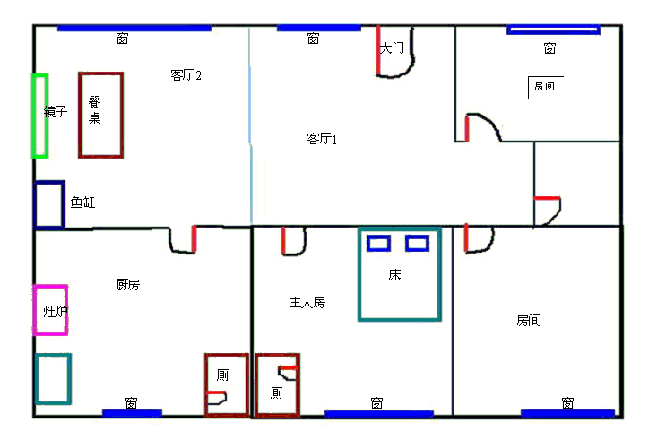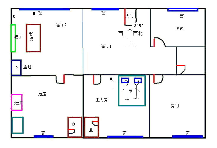 1)我的大门向 西和西北之间大概在(315′),尖头所指.