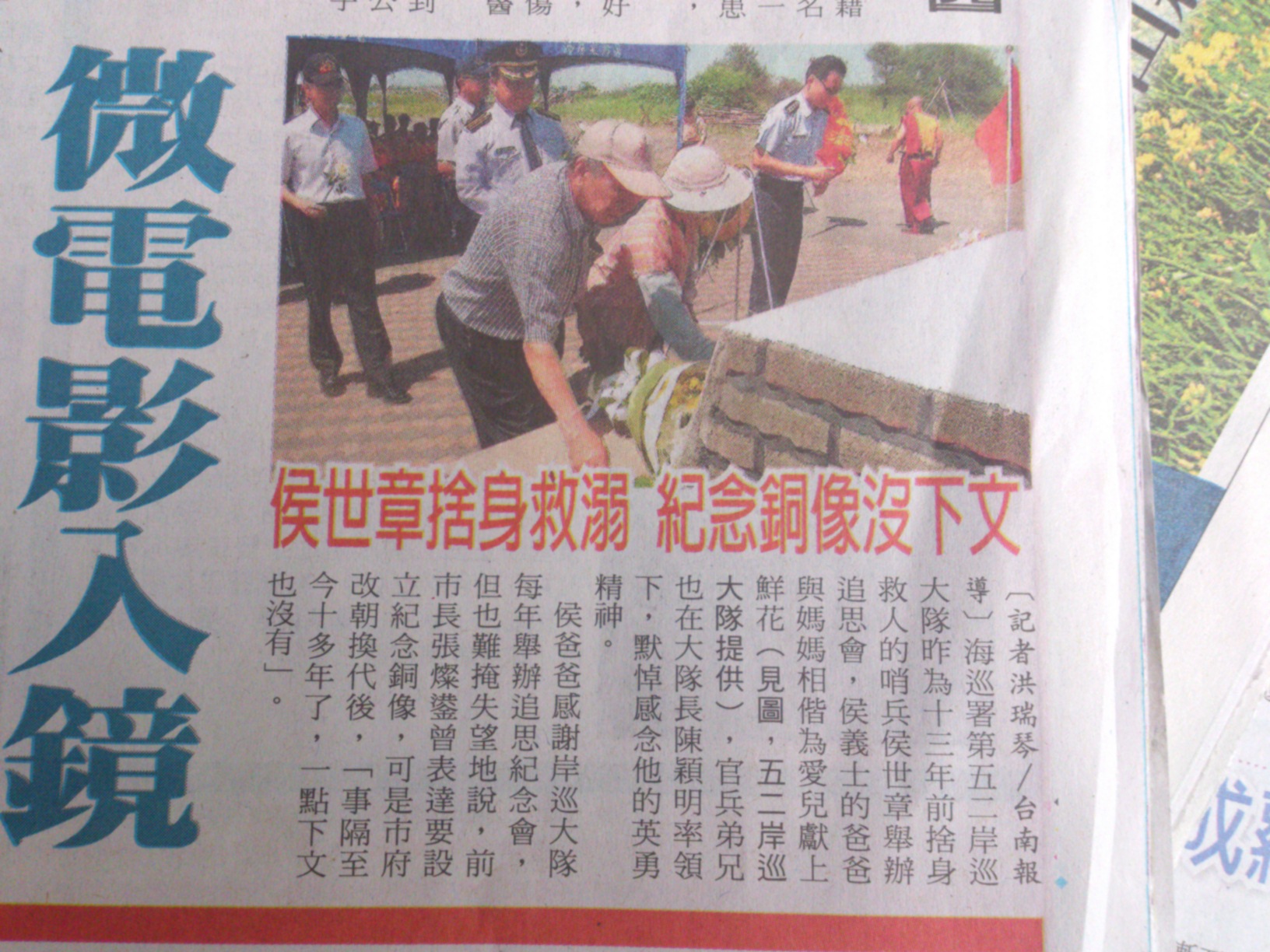 真抱歉!今日才看到pgup師傅的卜算!×·×原本,我是看到今日新聞,寫到13年前海軍士兵溺水悼念的文章,我想起我20樓曾經提過,>< 13年前台南海岸,有位義務義士兵,為了救溺水學生,不幸犧牲自己生命。:( 後來,我寫了一篇文章,投稿一本小型雜誌,紀念(懷念)侯世章弟兄犧牲生命的義行。## 不過,我20樓的日期大概記錯了。 我轉貼今天新聞照片如下。 相關新聞如下: http://www.eewow.com/2012/06/26-5106.htm